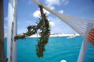 I Bermuda växer Rosmarin vilt i stora buskar. Jag knyckte med mig några kvistar till seglingen!